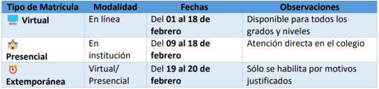 CONOGRAMA DE MATRÍCULA 2026 El proceso de matrícula para el año lectivo 2026 se realizará bajo una modalidad mixta: online y presencial. Podrán acceder a la matrícula solo los Padres de Familia o representantes legales que han cancelado completamente las pensiones del año 2025 y realizado el pago de la matrícula 2026. El horario para el proceso de matrícula será desde las 08:00 a.m. hasta las 01:00 p.m. PROCESO DE MATRÍCULA VIRTUAL 2026 Para ambas estudiantes, la matrícula se realiza principalmente por la plataforma SieWeb. El pago correspondiente a la matrícula debe realizarse con al menos 24 horas de anticipación para activar el sistema. Acceso a la Plataforma: Ingrese directamente a: https://nsfatima.sieweb.com.pe o ingrese por la página oficial del colegio https://nsfatima.org y seleccione la opción SIEWEB.  Utilice el usuario y contraseña asignados a la familia. Pasos para Realizar la Matrícula Virtual: Paso 1: Seleccione la opción Matricula, haga clic en Registro y finalmente elija el nombre de la estudiante para iniciar el proceso. Paso 2: Tras el mensaje de bienvenida, pulse "Siguiente". Paso 3: El sistema verificará el pago y la inexistencia de deudas. Si todo está en orden, aparecerá el mensaje “La estudiante cumple con los requisitos de matrícula”. Pulse "Siguiente" Paso 4: Complete y actualice todas las fichas solicitadas: -Estudiante: Actualice la información de la estudiante, responsable de pago, responsablede matrícula y suba una fotografía ACTUALIZADA en formato JPG (Obligatorio) -Familia: Actualizar y verificar los datos de la familia. Grabar y puse “Siguiente” -Padre y Madre: Actualizar y verificar los datos del padre y la madre. Grabar y puse “Siguiente” -Ficha Médica: Complete o verifique todos los datos. Grabar y “Siguiente” -Subir documento: Suba el DNI de la estudiante en formato PDF (Obligatorio). Paso 5: Lea detenidamente los documentos de condiciones del servicio (Contrato, Consentimiento de Datos, Autorizaciones, etc.). Si está de acuerdo, acepte virtualmente haciendo clic en "Sí, acepto".